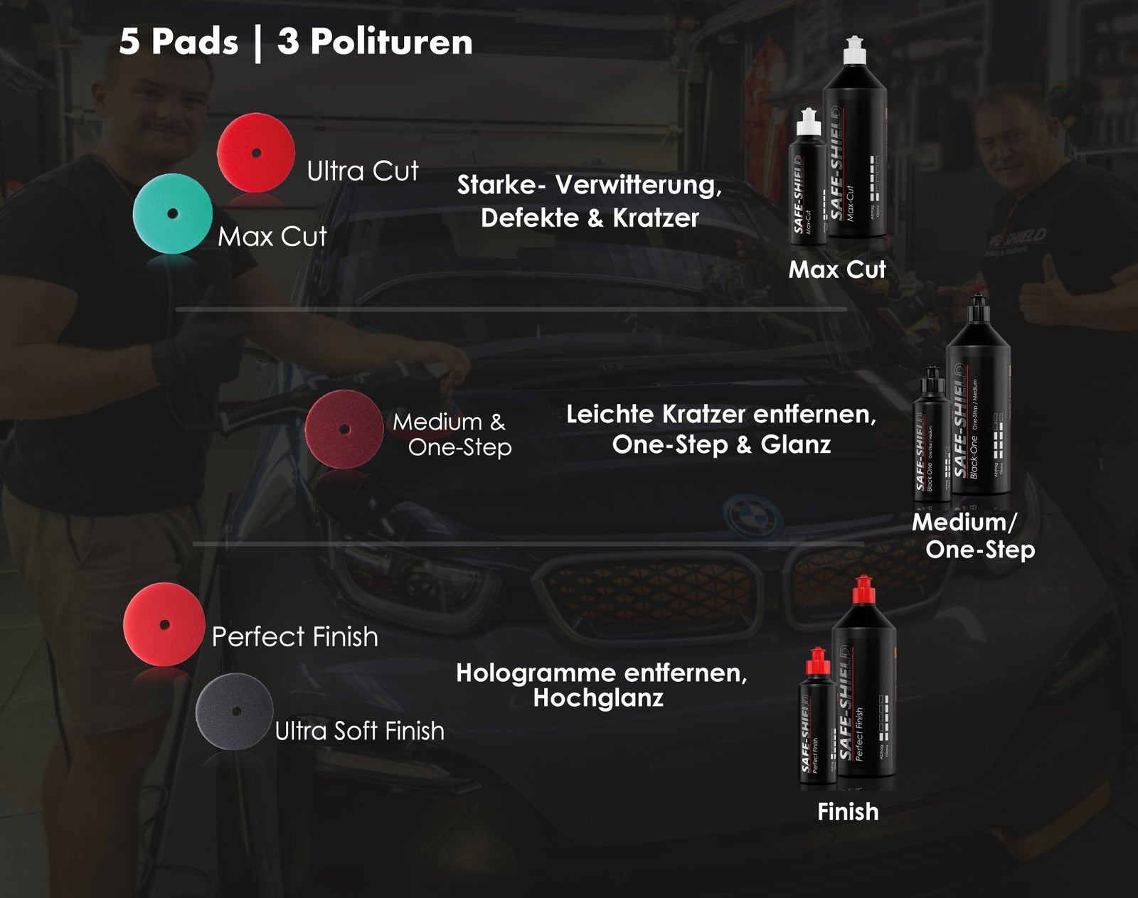 Bewährte Kombinations-Empfehlungen welche täglich bei Profis im Einsatz sind. Unser Zwei stufiges als auch unser Ein stufiges (one-step) Poliersystem.
