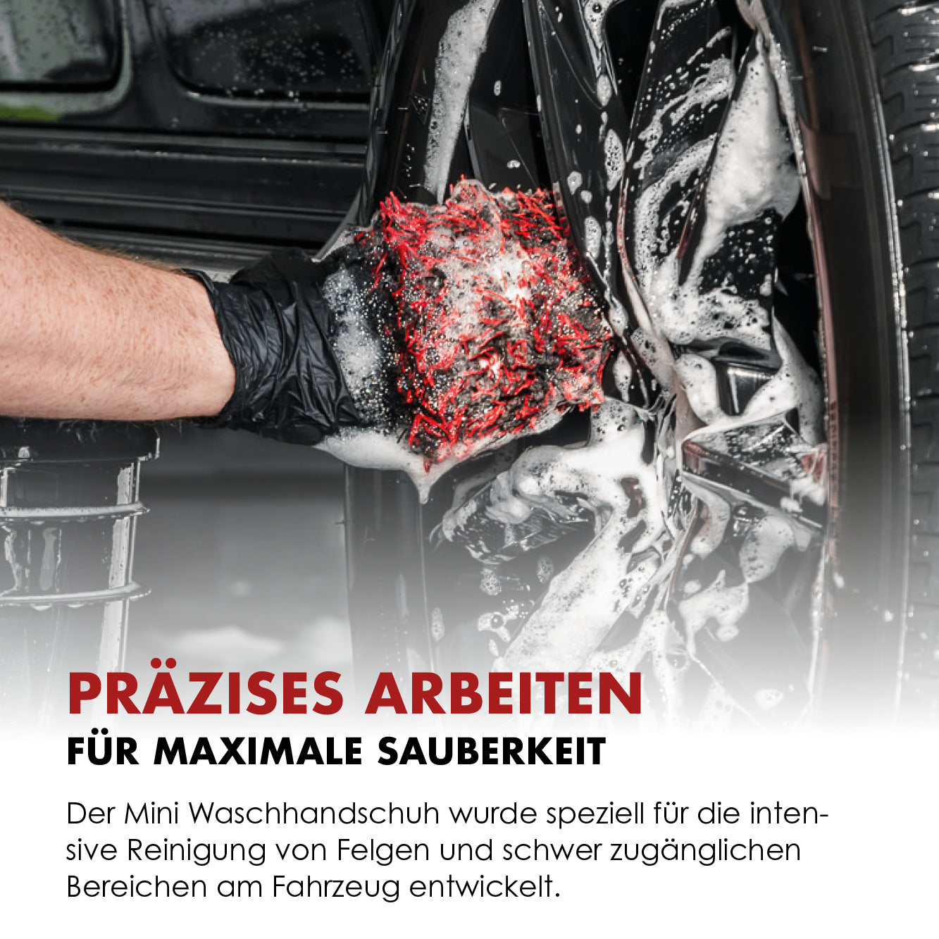 El mini guante de lavado para llantas ha sido desarrollado especialmente para limpiar las llantas de forma aún más precisa y a fondo, incluso donde los cepillos convencionales o los guantes grandes no llegan. Al tener contacto directo con la superficie, tienes un control total sobre cada movimiento y puedes llegar fácilmente a radios estrechos, huecos y bordes.