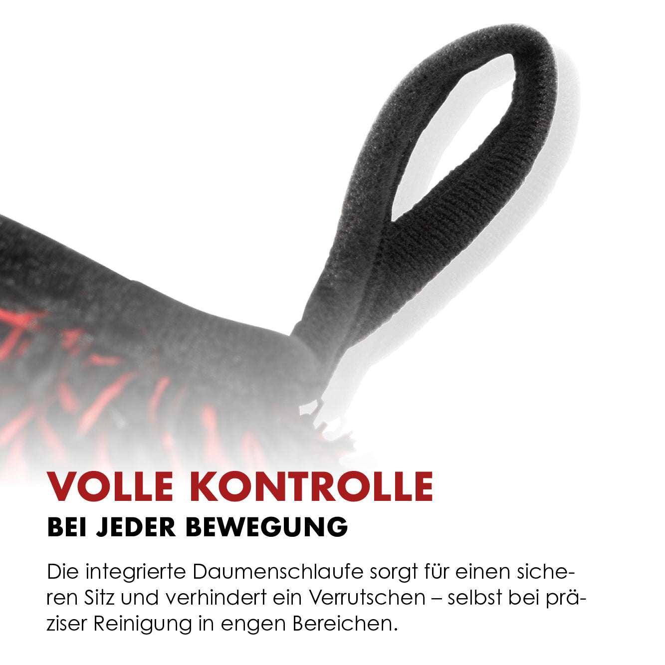La microfibra de alta calidad y pelo largo limpia de forma eficaz y, al mismo tiempo, especialmente delicada; ideal para superficies de llantas sensibles. La presilla para el pulgar integrada asegura un agarre firme, incluso con las manos mojadas o en trabajos delicados.